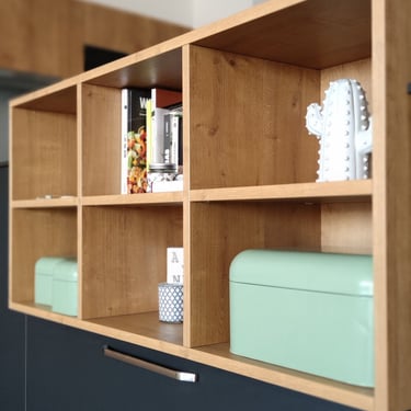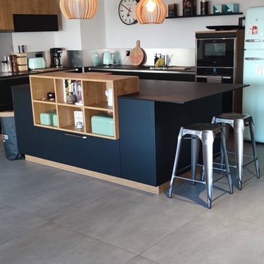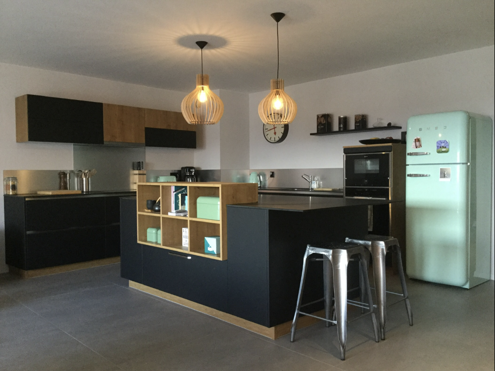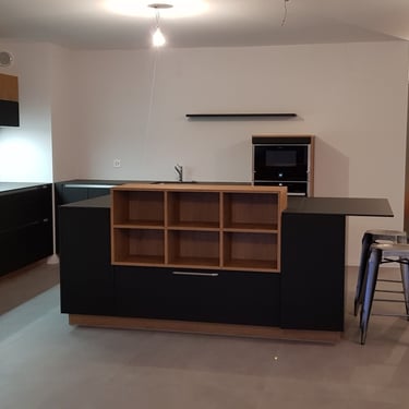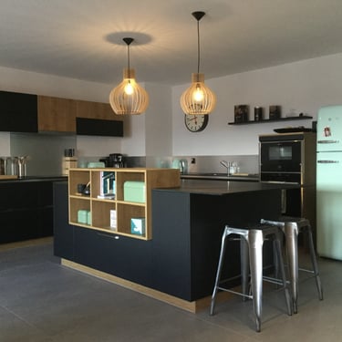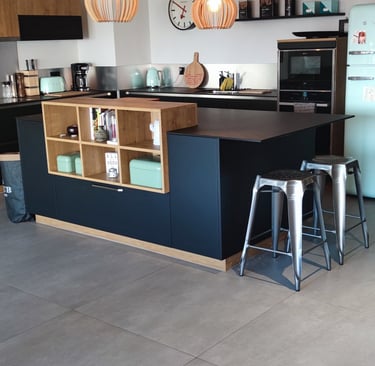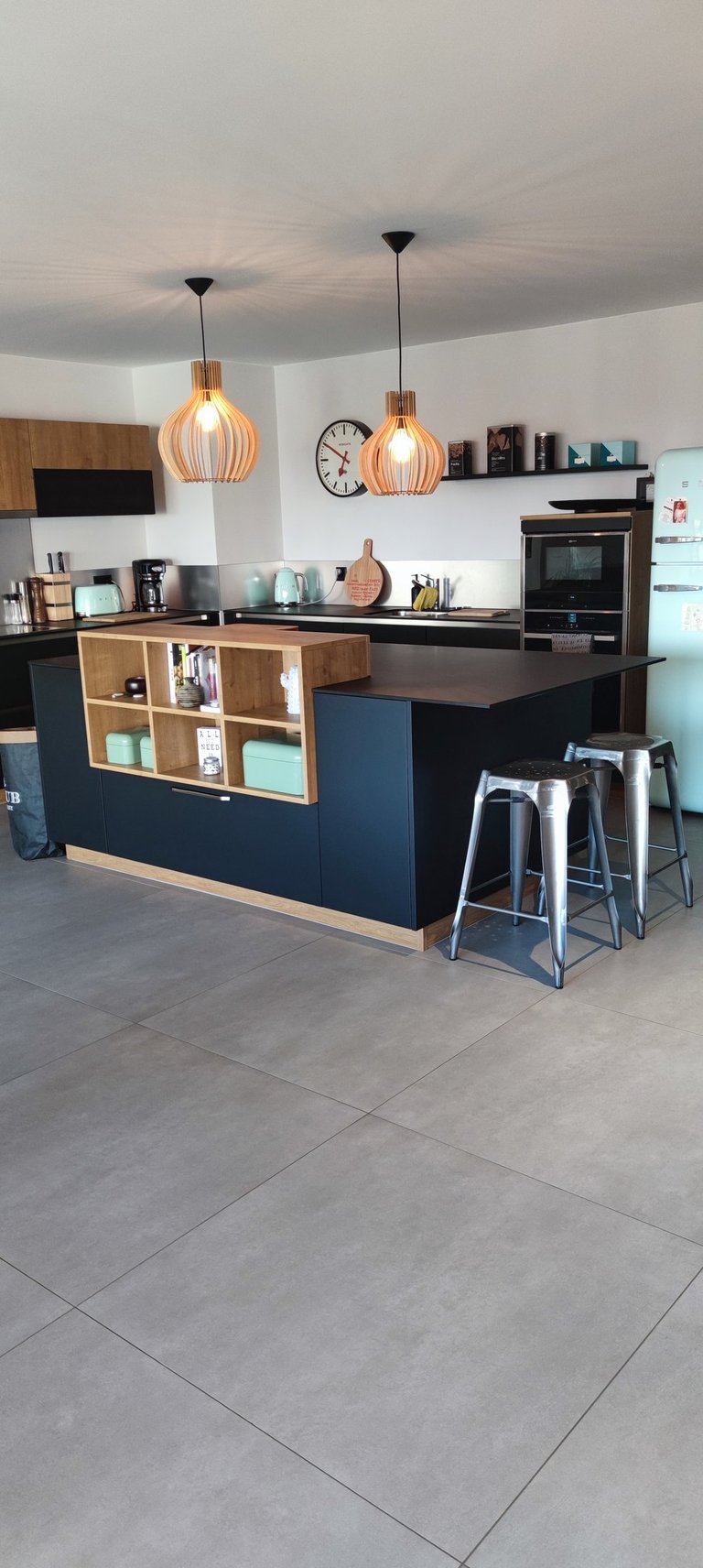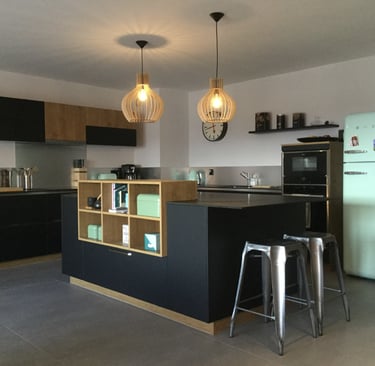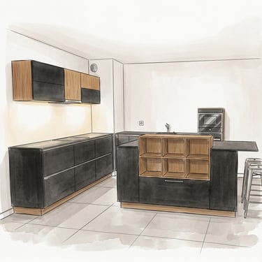 La cuisine, pensée comme un véritable élément structurant de l’espace, adopte une esthétique contemporaine mêlant le noir et le bois. Ouverte sur le séjour, elle allie élégance et fonctionnalité, avec des lignes épurées et des matériaux choisis pour leur caractère intemporel et raffiné. Elle dialogue naturellement avec le reste de la pièce, sans rupture visuelle.