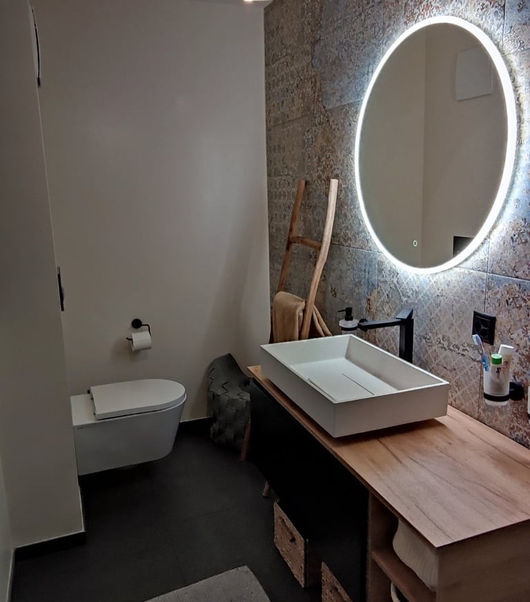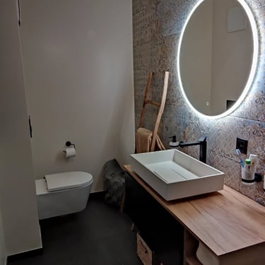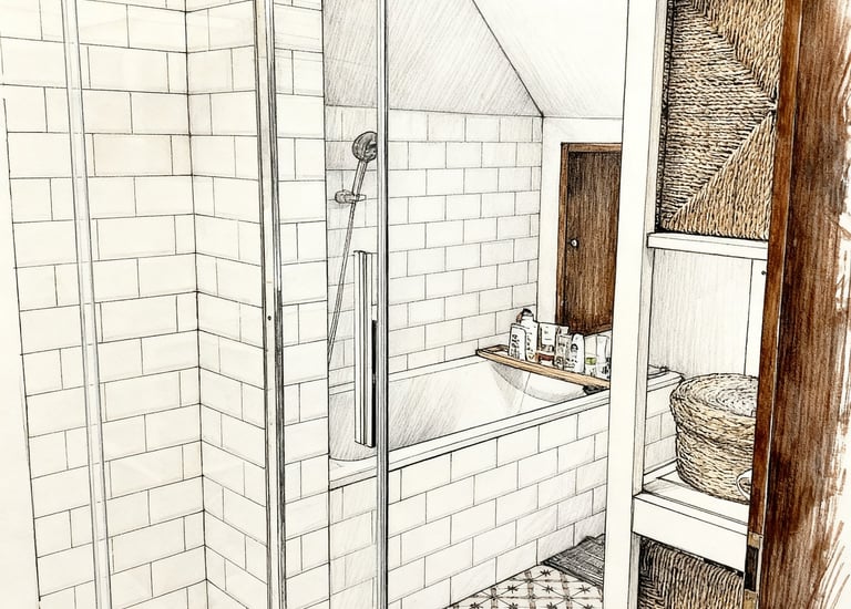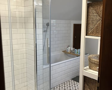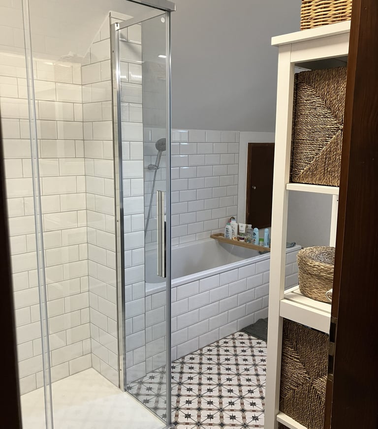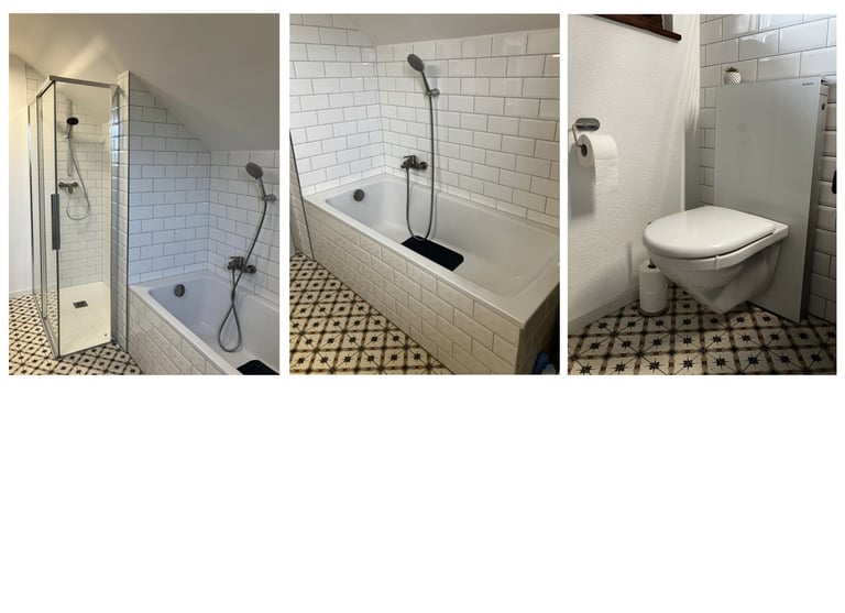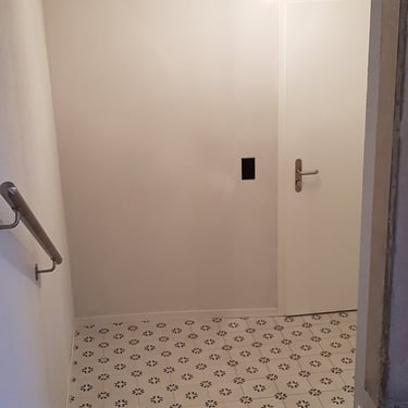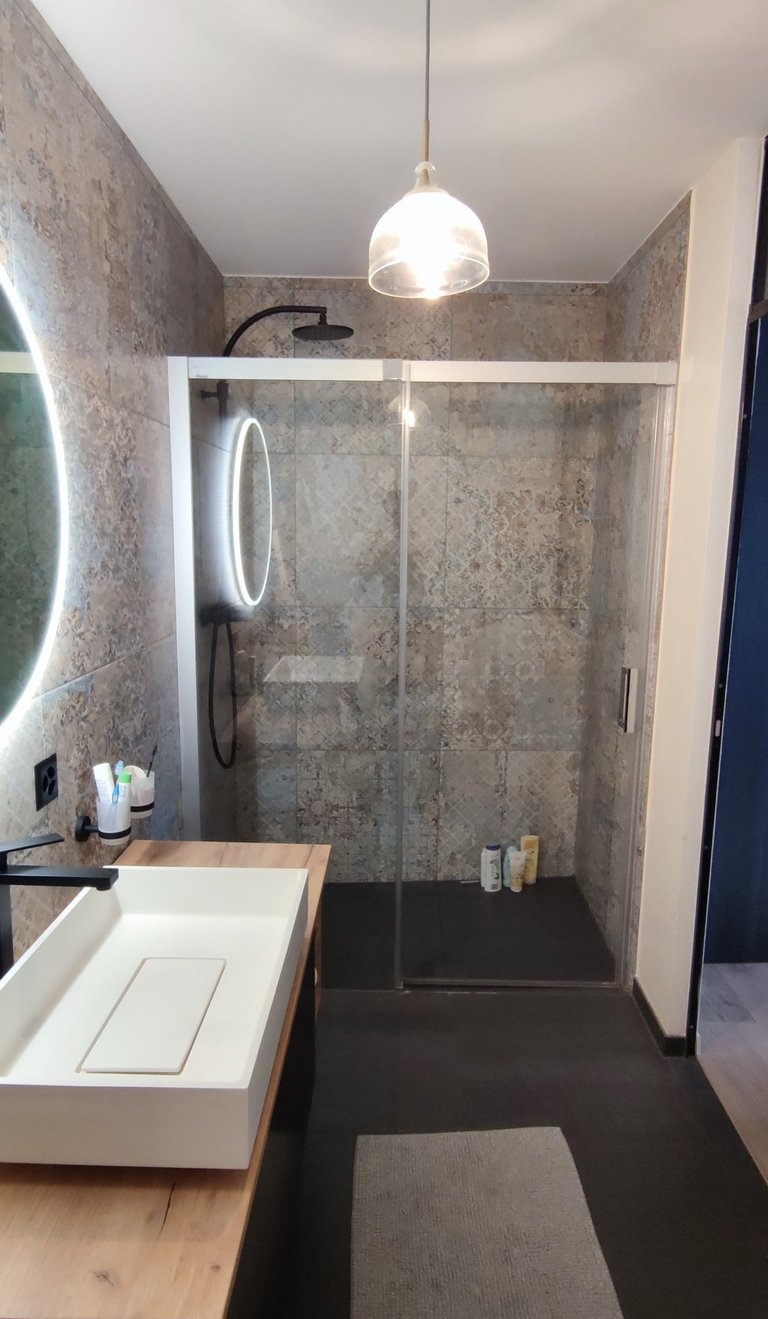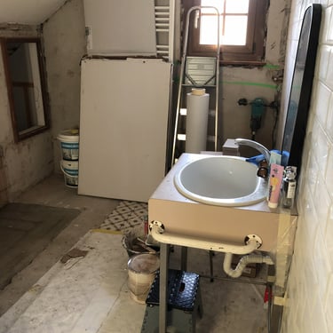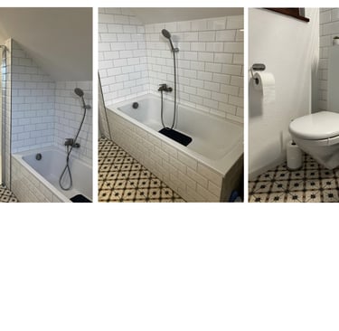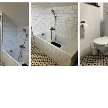 Les premières images montrent l’état initial et les phases de démolition : Tout a été déposé afin de repartir d’une page blanche. La nouvelle conception intègre une douche, une baignoire et des WC, organisés de manière fluide et équilibrée, avec une attention particulière portée aux volumes et aux usages quotidiens.