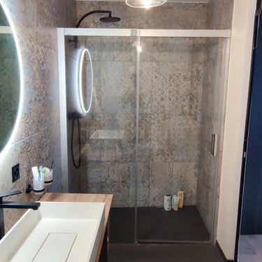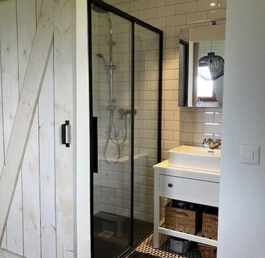 La salle de douche adopte une écriture contemporaine et sobre. Elle se compose d’une cabine de douche aux lignes épurées et d’un meuble vasque simple, fonctionnel et discret. Les choix de matériaux et de finitions participent à créer une continuité visuelle avec la chambre, pour une expérience fluide et reposante.