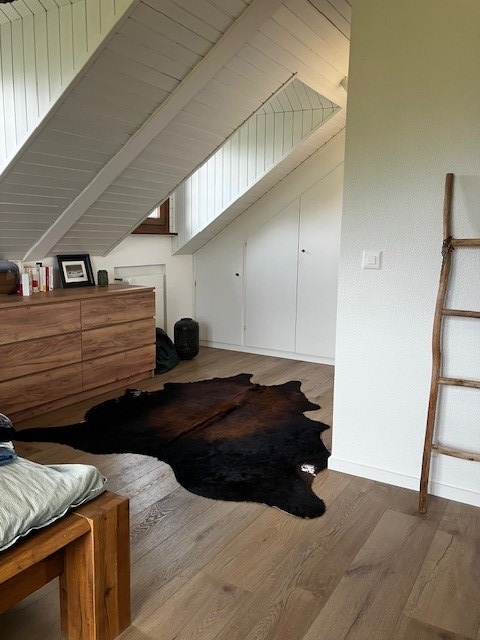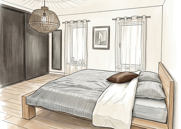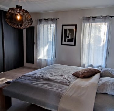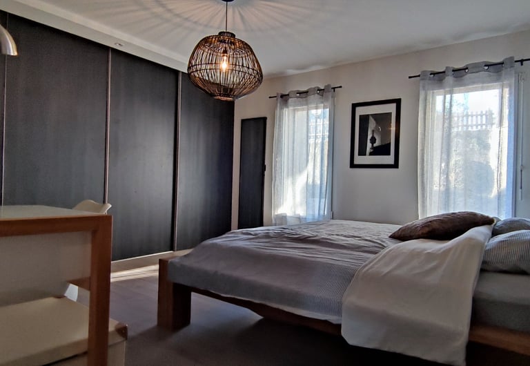 La chambre a été conçue dans un esprit cosy et apaisant, avec des matières chaleureuses, des teintes douces et une atmosphère feutrée. Le lien avec la salle d’eau se fait par une porte coulissante en bois, choisie pour son caractère naturel et son intégration harmonieuse dans l’ensemble, renforçant l’ambiance chaleureuse et cocooning du projet.