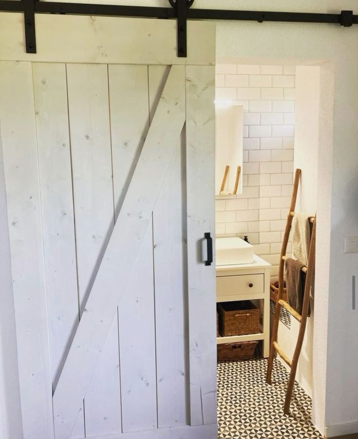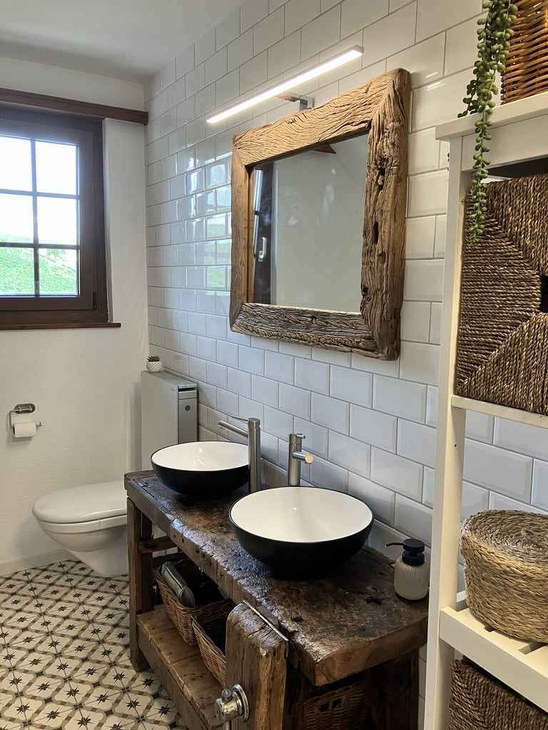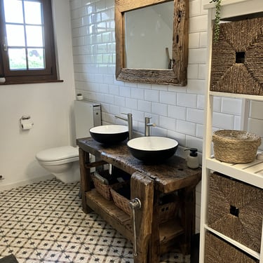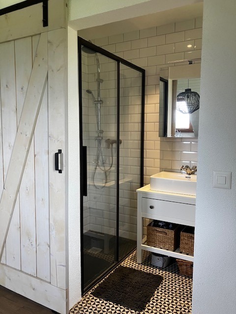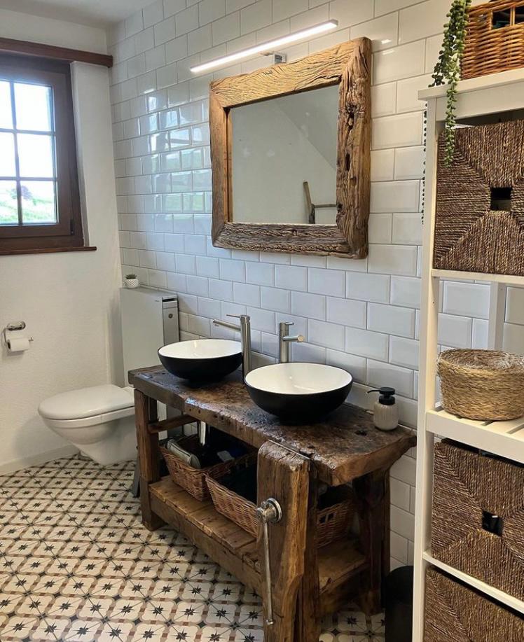 Les choix de matériaux structurent le projet. Les carreaux métro habillent les murs avec sobriété et intemporel, tandis que le sol graphique apporte rythme et caractère à l’ensemble. En pièce maîtresse, un ancien établi a été détourné en meuble de lavabo double vasque, créant un contraste subtil entre esprit industriel et lignes contemporaines.